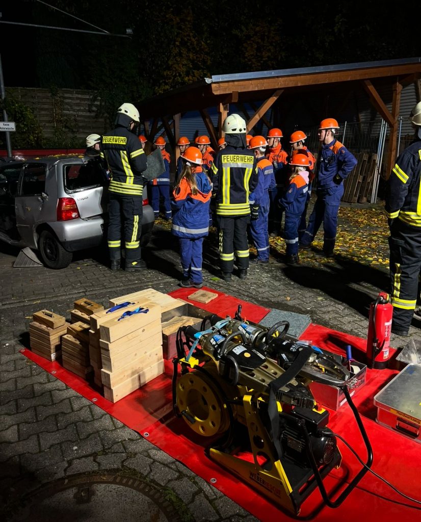 Kurz nach Mitternacht heulte ein letztes Mal der Alarm auf: „H KLEMM 1Y – Verkehrsunfall mit eingeklemmten Personen Dauborn“. Am Einsatzort bot sich erneut ein dramatisches Bild: Zwei Pkw waren zusammengestoßen, ein Beifahrer war im Wrack eingeklemmt, und ein Kind befand sich im hinteren Fahrzeugteil. Mit Schere und Spreizer befreiten die Jugendlichen den Beifahrer, während parallel die Rettung des Kindes durch Zerstören der Seitenscheibe erfolgte. Präzises Arbeiten und gute Absprache waren hier gefragt – und beide Jugendfeuerwehren meisterten die Aufgabe souverän.