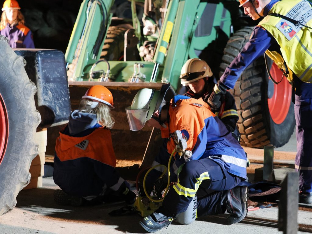 Doch kaum war das Abendessen beendet, ertönte bereits der nächste Einsatz: „TH-VU – Arbeitsunfall auf dem Hof Madlahn Kirberg“. Am Einsatzort bot sich ein anspruchsvolles Szenario: Zwei Traktoren waren kollidiert, eine Person war unter der Schaufel eines Traktor eingeklemmt. Zusätzlich drohte ein mit Diesel beladener LKW umzukippen, aus dessen Tank bereits Kraftstoff auslief. Während die Jugendlichen den Dieseltank abdichteten und den LKW mit dem Paratechsystem abstützten, wurde parallel die eingeklemmte Person mit Hebekissen befreit – eine technisch anspruchsvolle Aufgabe, die mit viel Geschick und Teamarbeit gemeistert wurde.