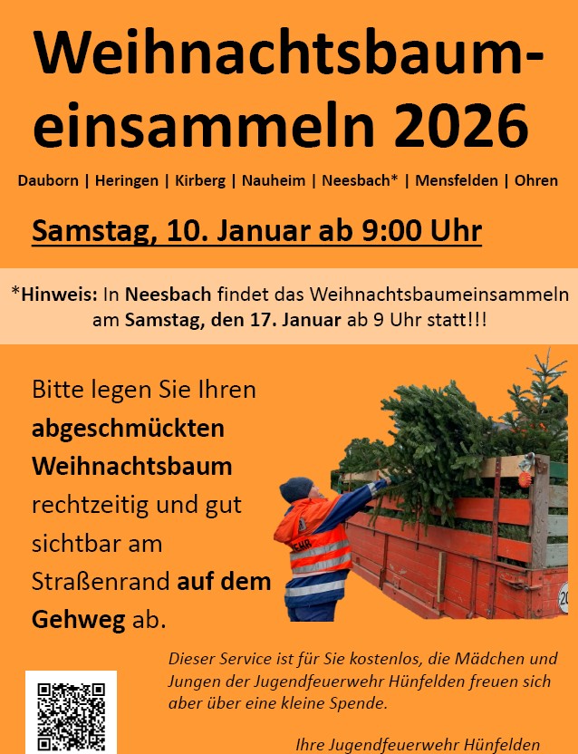 Am Samstag, dem 10. Januar 2026 sammeln die Jugendfeuerwehren mit Unterstützung der Einsatzabteilungen in allen Hünfeldener Ortsteilen wieder die ausgedienten Weihnachtsbäume ein. Legen Sie dazu einfach Ihren abgeschmückten Weihnachtsbaum am 10.01. bis 9 Uhr gut sichtbar am Straßenrand (und nicht auf dem Grundstück) ab.