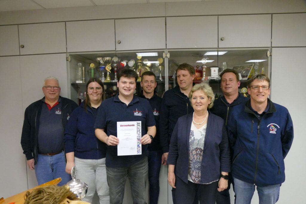 Zum Ende der Jahreshauptversammlung meldete sich Kreisjugendfeuerwehrwart Holger Jung zu Wort. Denn eine Ehrung stand an. Als Dank für die hervorragende Jugendarbeit erhielt Jonas Schmidt die Kreisjugendfeuerwehr Ehrennadel in Silber.