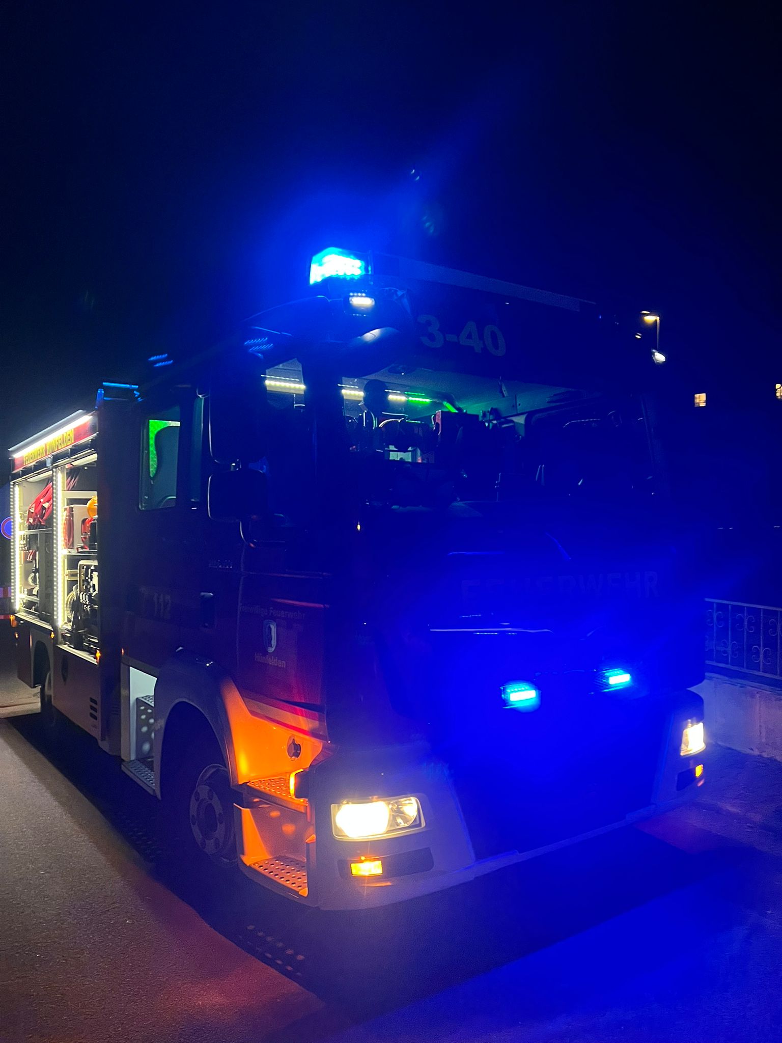 Ein Anwohner wies die erkundenden Einheitsführer bereits auf die Anzahl der vermissten Personen und mögliche Eingänge hin während die Mannschaft Wasserversorgung und Beleuchtung aufbaute und mehrere Trupps sich zur Menschenrettung mit Atemschutzgeräten ausrüsteten. Da im Erdgeschoss alle Fenster mit Gittern versehen und die Haustür verschlossen war, war der Einstieg nur über die Leiter in ein offenes Fenster sowie über Leiter und Balkon ins Obergeschoss möglich. Durch den dichten Nebel war zunächst kaum Sicht möglich, sodass die Trupps unter Atemschutz verschiedene Techniken zum Absuchen der Räumlichkeiten nach den vermissten Personen anwandten. Eine Person konnte zügig auf den Balkon gebracht und über die Leiter gerettet werden. Auf der Suche nach weiteren Personen verunglückte ein Feuerwehrmann auf der Treppe, sodass der Atemschutznotfall angenommen wurde.